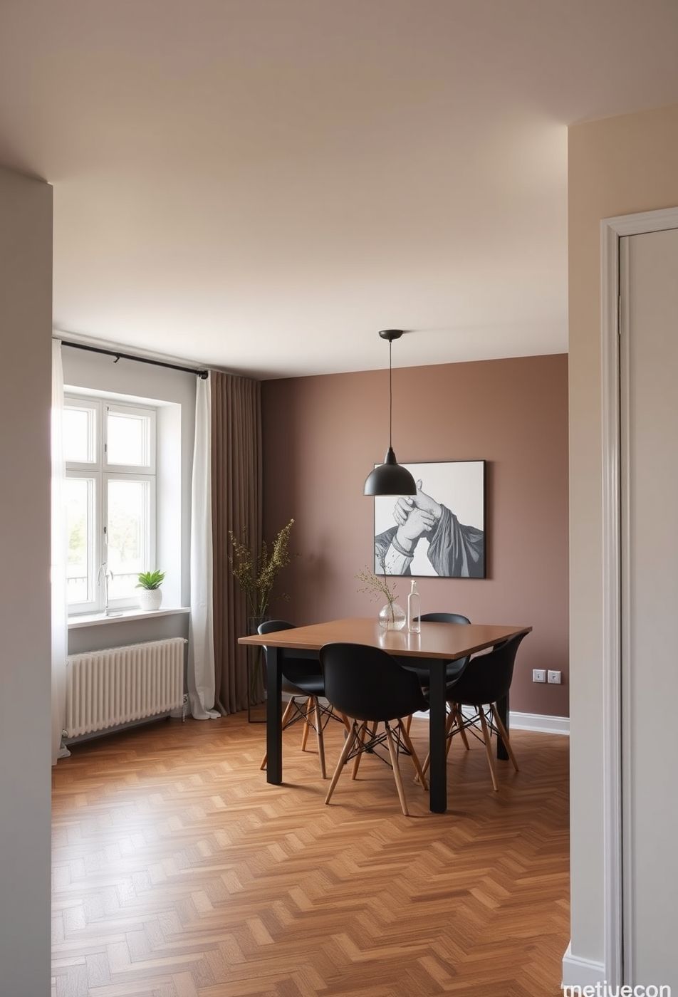 Dieser Raum strahlt eine ruhige und elegante Atmosphäre aus, die durch die erdigen Farbtöne und den minimalistischen Ansatz entsteht. Die Mauve-farbene Wand bildet einen warmen Hintergrund für das Schwarz-Weiß-Kunstwerk, das als zentraler Blickfang dient. Der Holzboden in Fischgrätenmuster verleiht dem Raum Tiefe und Textur, während der schlichte Holztisch mit den modernen schwarzen Stühlen einen klaren Kontrast bildet. Die reduzierte Dekoration, bestehend aus einer einfachen Vase mit Zweigen und einer einzelnen Pflanze auf der Fensterbank, unterstreicht den minimalistischen Charakter des Raumes.