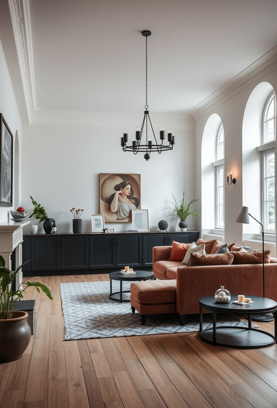 Der Raum verkörpert eine harmonische Mischung aus klassischer Architektur und modernem Wohngefühl. Hohe Decken mit Stuckverzierungen und Bogenfenster schaffen eine elegante Grundlage, während die Einrichtung einen zeitgemäßen Akzent setzt. Die Farbpalette ist gedämpft und beruhigend, dominiert von Weiß, Erdtönen und Akzenten in Schwarz. Ein rostfarbenes Sofa bildet den Mittelpunkt des Raumes und lädt zum Verweilen ein. Der schwarze Schrank entlang der Wand dient als stilvoller Stauraum und bietet Platz für dekorative Elemente wie Pflanzen, Vasen und Bilder.