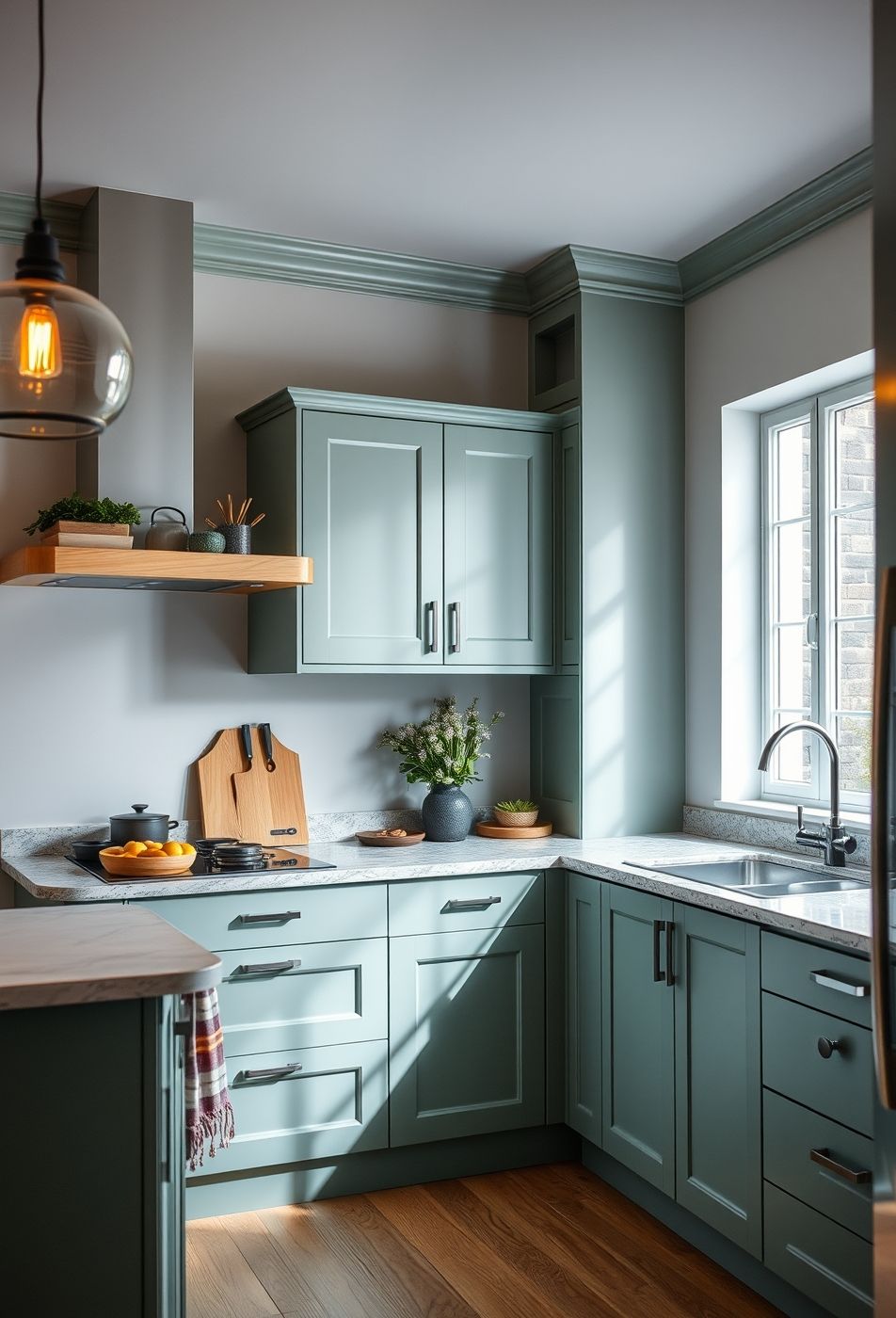 Die Küche in diesem Bild strahlt eine beruhigende und einladende Atmosphäre aus. Der dominierende Farbton ist ein sanftes Salbeigrün, das sowohl modern als auch zeitlos wirkt. Die klaren Linien der Schränke, kombiniert mit den schlichten, dunklen Griffen, verleihen der Küche eine elegante Note. Die Arbeitsplatte in hellem Grau mit subtilen Marmorierungen ergänzt das Grün perfekt und sorgt für einen frischen Kontrast. Ein Hauch von Wärme wird durch das Holz des Bodens und der Dunstabzugshaube eingebracht, was dem Raum eine natürliche und gemütliche Note verleiht.