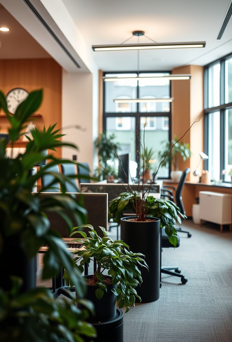 Was diesen Stil besonders macht, ist die bewusste Integration von Natur in eine Arbeitsumgebung. Die Pflanzen lockern die sterile Büroatmosphäre auf und fördern das Wohlbefinden. Die ausgewählten Töpfe, von schlichten schwarzen Modellen bis hin zu einem natürlicheren Holzton, ergänzen das Gesamtbild harmonisch. Das Lichtspiel, das durch die Fenster und die Pflanzen entsteht, verleiht dem Raum zusätzlich Tiefe und Lebendigkeit.