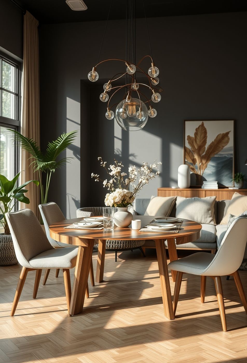Ein besonderes Highlight ist die auffällige Deckenleuchte im Sputnik-Design, die dem Raum einen Hauch von Retro-Charme verleiht und gleichzeitig für ausreichend Licht sorgt. Die Stühle im Eames-Stil passen perfekt zum Gesamtbild und ergänzen den modernen Look. Die frischen Blumen in der Vase bringen Leben und Frische in den Raum, während die Zimmerpflanze für einen natürlichen Akzent sorgt. Insgesamt entsteht ein harmonisches Zusammenspiel aus dunklen und hellen Farben, modernen und klassischen Elementen, das zum Verweilen einlädt.