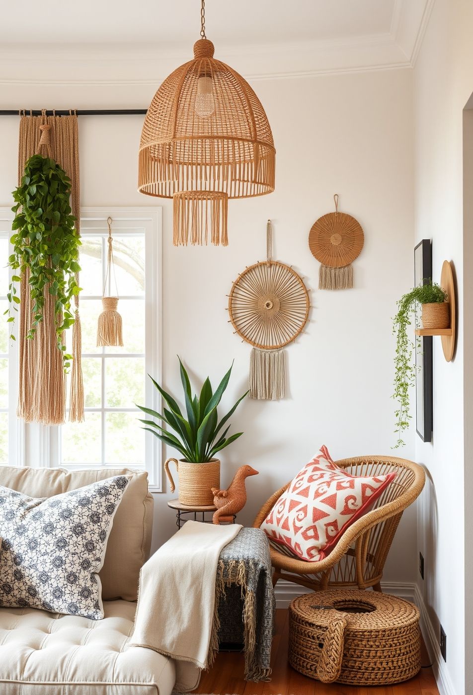 Der Fokus liegt auf Textur und organischen Formen. Weiche Kissen mit ethnischen Mustern und ein gemütlicher Überwurf laden zum Entspannen ein. Der Rattansessel mit dem roten Kissen verstärkt den Eindruck eines entspannten und unkonventionellen Ambientes. Grüne Pflanzen, die von der Decke oder von Regalen herabhängen, bringen Leben und Frische in den Raum. Die natürliche Beleuchtung, die durch das Fenster einfällt, unterstreicht die warme und einladende Atmosphäre.