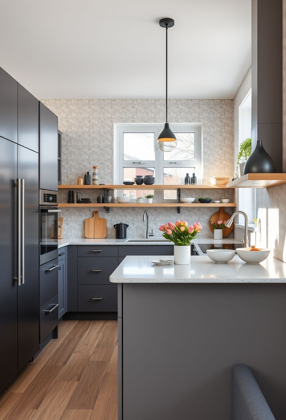 Die hier dargestellte Küche besticht durch ihre zeitlose Eleganz und die einladende Atmosphäre. Die dunklen Grautöne der Küchenschränke bilden einen schönen Kontrast zu den hellen Wänden und der warmen Holzoptik der Arbeitsflächen und Regale. Das große Fenster mit Blick ins Grüne sorgt für viel natürliches Licht und eine angenehme Verbindung zur Natur. Die offenen Regale, die mit dekorativen Gegenständen wie Geschirr, Pflanzen und Holzakzenten geschmückt sind, verleihen dem Raum eine persönliche Note und lockern die strenge Linienführung auf.