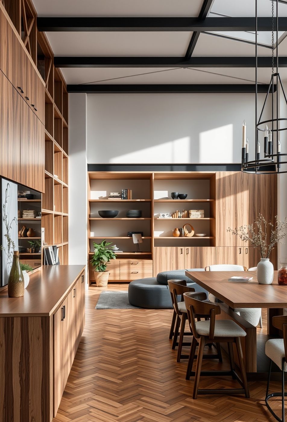 Der Raum strahlt eine zeitlose Eleganz aus, die durch die Verwendung von warmen Holztönen dominiert wird. Die hohen Holzregale und Schränke an einer Wand schaffen eine beeindruckende Struktur, die sowohl praktisch als auch dekorativ ist. Das Fischgrätenmuster des Holzbodens verleiht dem Raum eine klassische Note und unterstreicht die hochwertige Materialwahl. Die Farbpalette ist größtenteils neutral, mit Akzenten in Grau und Schwarz, die durch Details wie die Deckenbalken und die moderne Pendelleuchte eingebracht werden.