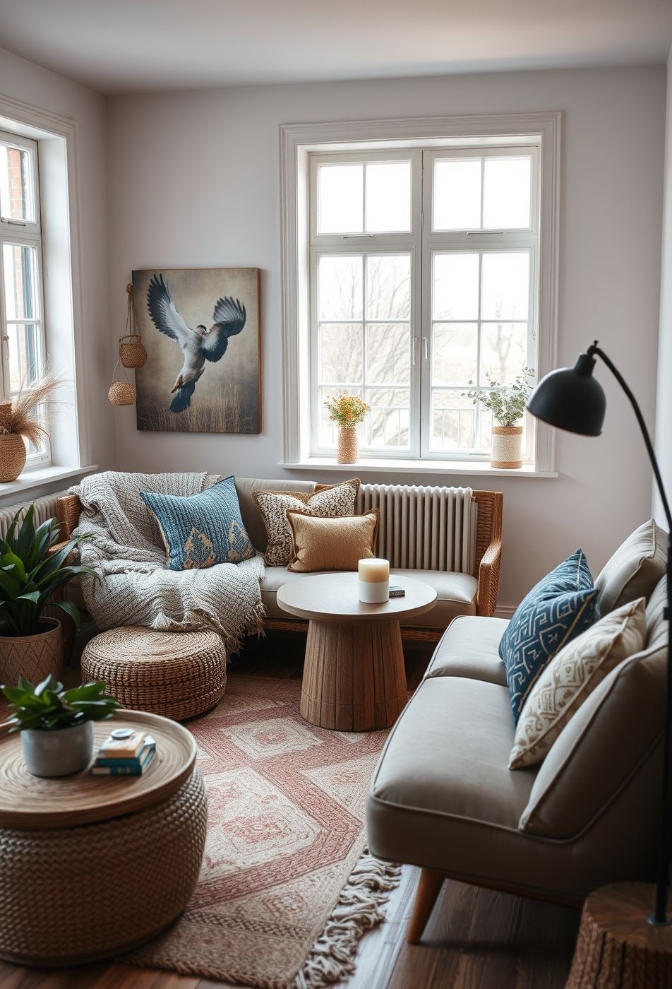 Die Einrichtung ist sorgfältig ausgewählt, um Funktionalität und Ästhetik zu vereinen. Ein graues Sofa mit dekorativen Kissen lädt zum Entspannen ein, während ein runder Holztisch und ein Pouf eine zwanglose Atmosphäre schaffen. Die Beleuchtung ist warm und gedämpft, dank einer Hängelampe aus Rattan, die das Licht sanft streut. Pflanzen in geflochtenen Körben bringen einen Hauch von Natur in den Raum und sorgen für eine lebendige Note. Kunstwerke mit abstrakten Motiven und rustikale Wanddekorationen vervollständigen das Gesamtbild.