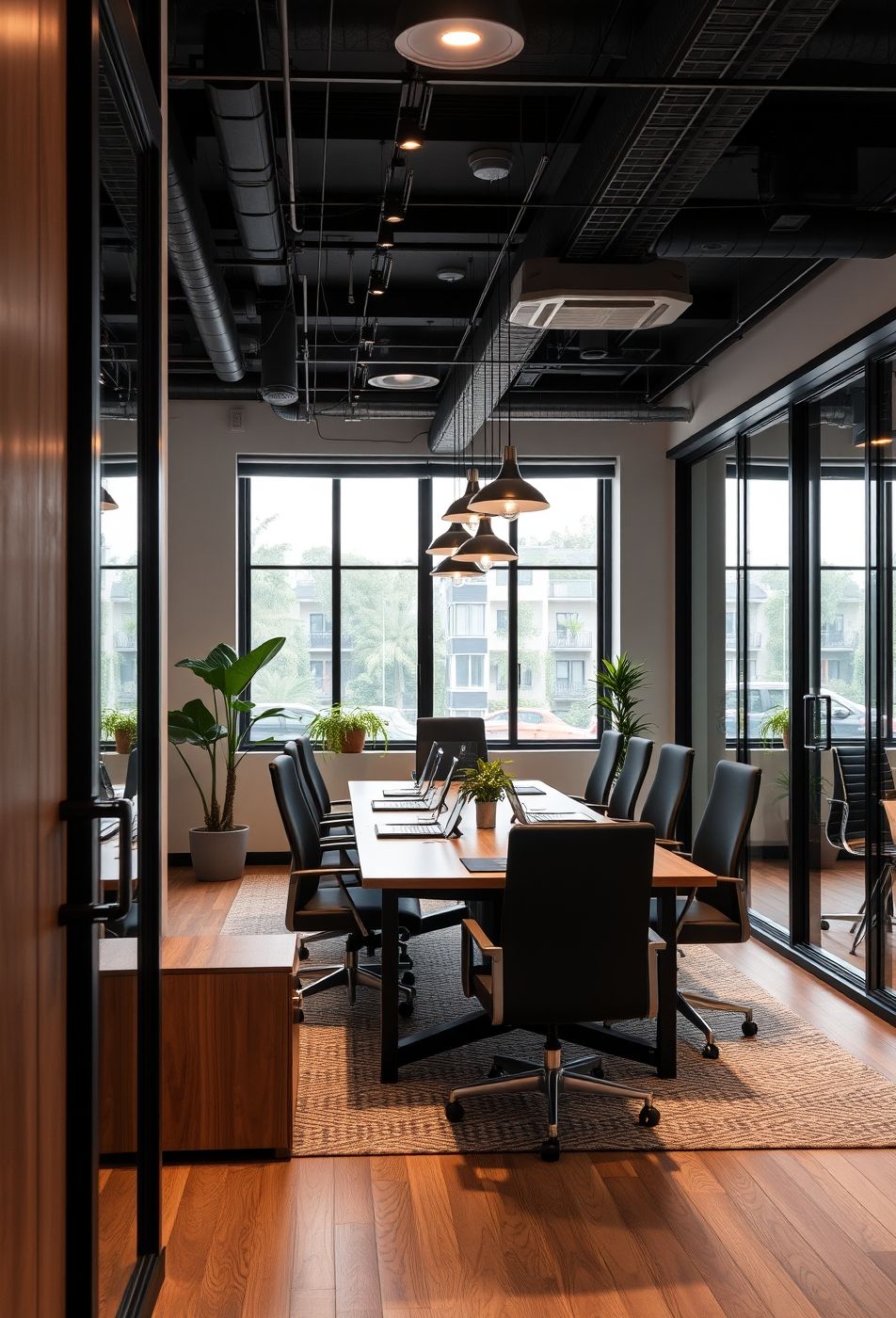 Der Raum präsentiert sich in einem modernen, fast industriellen Stil, der durch warme Holztöne und grüne Akzente aufgelockert wird. Die Decke ist auffällig gestaltet mit offenliegenden Rohren und Leitungen, die schwarz lackiert sind und dem Raum einen rohen, urbanen Touch verleihen. Große Fensterfronten sorgen für viel natürliches Licht und bieten einen Blick ins Grüne, was eine angenehme Arbeitsatmosphäre schafft. Der lange Konferenztisch aus Holz, umgeben von eleganten, schwarzen Bürostühlen, bildet das Zentrum des Raumes.