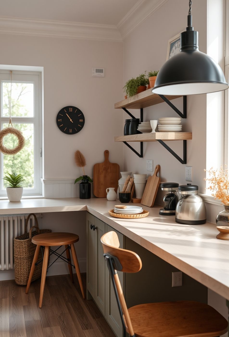 Dieser Küchendekor strahlt eine einladende Wärme und schlichte Eleganz aus. Die Kombination aus hellem Holz, neutralen Wandfarben und subtilen Akzenten schafft eine ruhige und harmonische Atmosphäre. Besonderes Augenmerk liegt auf der natürlichen Beleuchtung, die durch die großen Fenster optimal genutzt wird. Grüne Pflanzen lockern das Gesamtbild auf und bringen einen Hauch von Frische und Leben in den Raum.